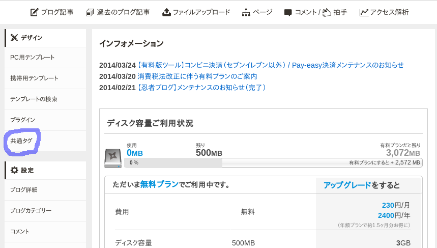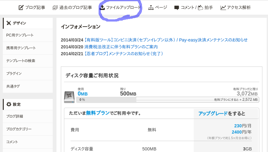 忍者ブログの場合、ファイルのアップロードをするには管理ページのリンクから行える。とりあえず必要なのは、